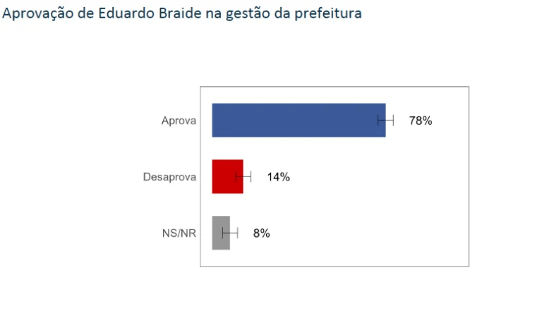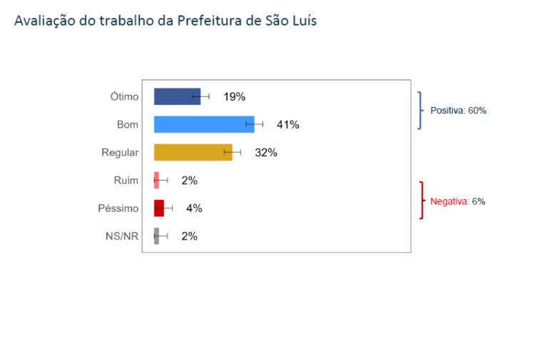 A gestão de Eduardo Braide à frente da prefeitura de São Luís foi avaliada positivamente por 78% dos entrevistados. Desse total, 41% consideram a administração “boa”, enquanto 19% a classificam como “ótima”. Por outro lado, 14% desaprovam a gestão e 8% não souberam opinar. Apenas 6% dos entrevistados avaliaram a administração como “ruim” ou “péssima”.