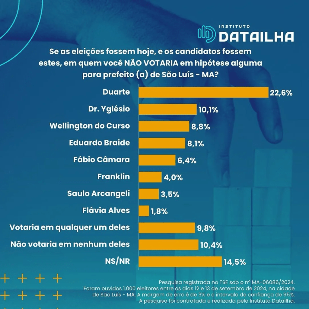 A pesquisa do Instituto Datailha possui margem de erro de 3%, o que significa que os resultados podem variar ligeiramente, mas mesmo dentro da margem, Braide continua bem à frente de seus oponentes. O intervalo de confiança de 95% garante que os dados refletem com precisão o cenário eleitoral atual na capital maranhense.