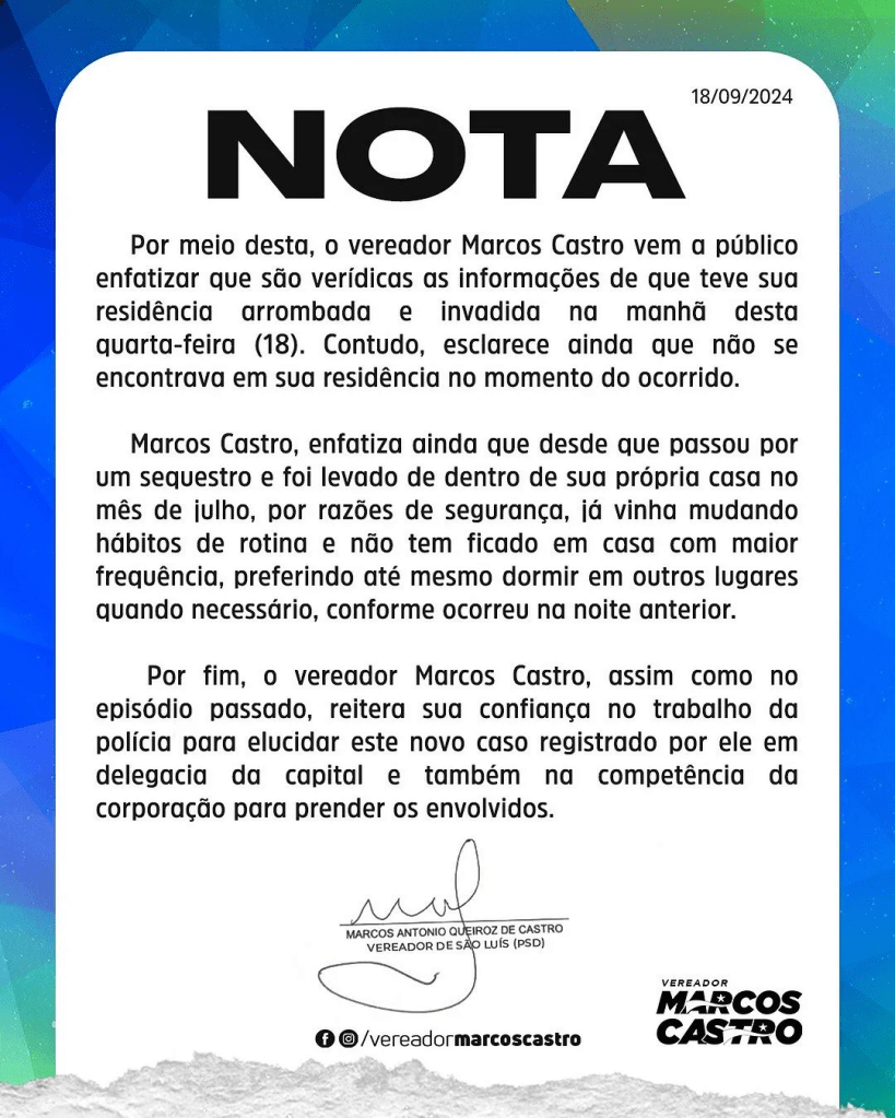 A casa do vereador Marcos Castro foi alvo de criminosos na manhã desta quarta-feira (18), no bairro do Olho d’Água, em São Luís. Segundo informações do parlamentar, a residência foi invadida e arrombada enquanto ele estava fora. Ao retornar por volta das 9h, Marcos Castro encontrou o portão arrancado dos trilhos e o interior da casa completamente revirado.