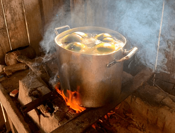 Os frutos são, então, seccionados com facão ou serrote, e as cuias resultantes são colocadas em uma grande panela de água fervente, para que as cascas amoleçam. Depois, a casca externa de cada cuia é cuidadosamente raspada com uma lâmina, a borda é alisada com a língua áspera do peixe pirarucu (Arapaima gigas) e o interior com a escama do mesmo peixe. A preparação final para aplicação do verniz é feita esfregando-se o interior e o exterior com as grandes folhas da árvore embaúba (Cecropia), uma espécie também presente na área próxima à residência da família. A cuia tratada, mas ainda sem verniz, é chamada de “pitinga”.