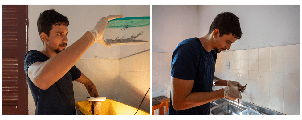 Depois de instalar armadilhas em 20 pontos na ilha, a equipe visitava diariamente os locais para coletar os animais capturados. Eram feitas ainda buscas ativas diurnas e noturnas, procurando os répteis e anfíbios no chão e na vegetação, como no caso de espécies arborícolas. Os indivíduos eram então levados até a base, onde passavam por uma série de testes no laboratório de campo montado durante a expedição.