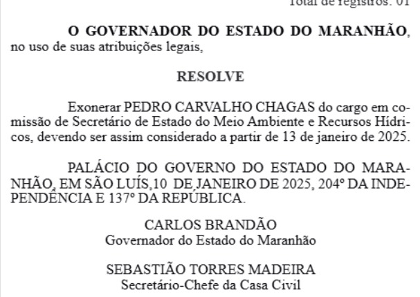 Nesta segunda-feira (13), o Governo do Maranhão anunciou a exoneração de Pedro Chagas do cargo de Secretário do Meio Ambiente. A decisão foi oficializada pelo governador Carlos Brandão e pelo secretário-chefe da Casa Civil, Sebastião Madeira, através de publicação no Diário Oficial do Estado.