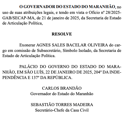 O governador do Maranhão, Carlos Brandão (PSB), realizou nesta quarta-feira, 22, mais uma alteração em sua equipe de governo, reforçando os movimentos estratégicos para consolidar sua base política.