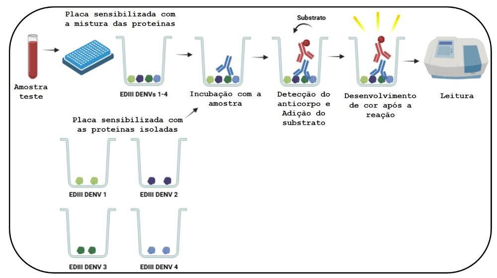 Com o objetivo de tornar mais preciso o exame que detecta anticorpos presentes no sangue de pessoas previamente infectadas, mesmo aquelas sem sintomas aparentes, os pesquisadores utilizaram fragmentos de proteínas dos vírus, em particular a proteína do envelope viral (a camada mais externa do patógeno). Tal fragmento, denominado EDIII, está envolvido na ligação do vírus às células humanas.