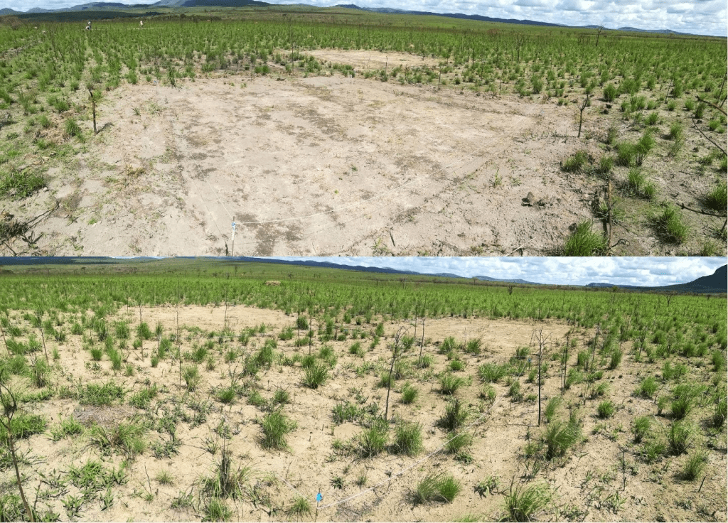Em 2021, a restauração foi retomada. Desta vez, foi estabelecido o experimento para verificar o efeito da acidificação do solo na contenção do capim exótico. Os pesquisadores demarcaram 14 blocos de 100 metros quadrados (m2). Em cada um deles, separaram quatro blocos menores, de 1 m2 cada, separados em 10 metros de distância entre si.