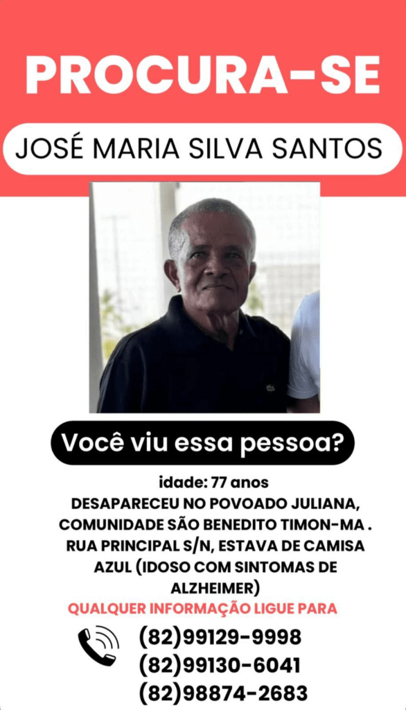 José Maria Silva Santos é descrito como um senhor de 77 anos, com sintomas de Alzheimer, o que aumenta a preocupação da família, já que a doença pode causar desorientação e dificuldades de locomoção. Ele desapareceu na Rua Principal, S/N, no povoado Juliana, uma região rural de Timon.
