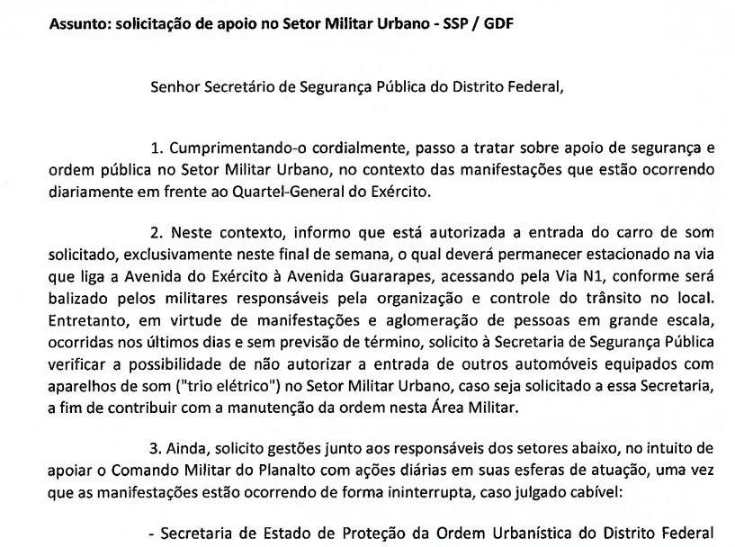 Um ofício de 4 de novembro, assinado pelo alto escalão militar, autorizou a entrada de um carro de som no acampamento “exclusivamente neste final de semana”. Outro documento, do dia anterior, pedia que a SSP impedisse a chegada de novos trios elétricos, mas mantivesse o apoio aos protestos.