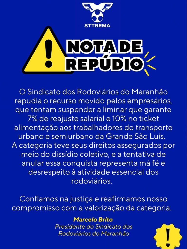O Sindicato dos Rodoviários do Maranhão manifestou repúdio ao recurso apresentado por empresários do setor de transporte, que buscam suspender uma liminar que garante um reajuste de 7% nos salários e de 10% no vale-alimentação para trabalhadores do transporte urbano e semiurbano da Grande São Luís.