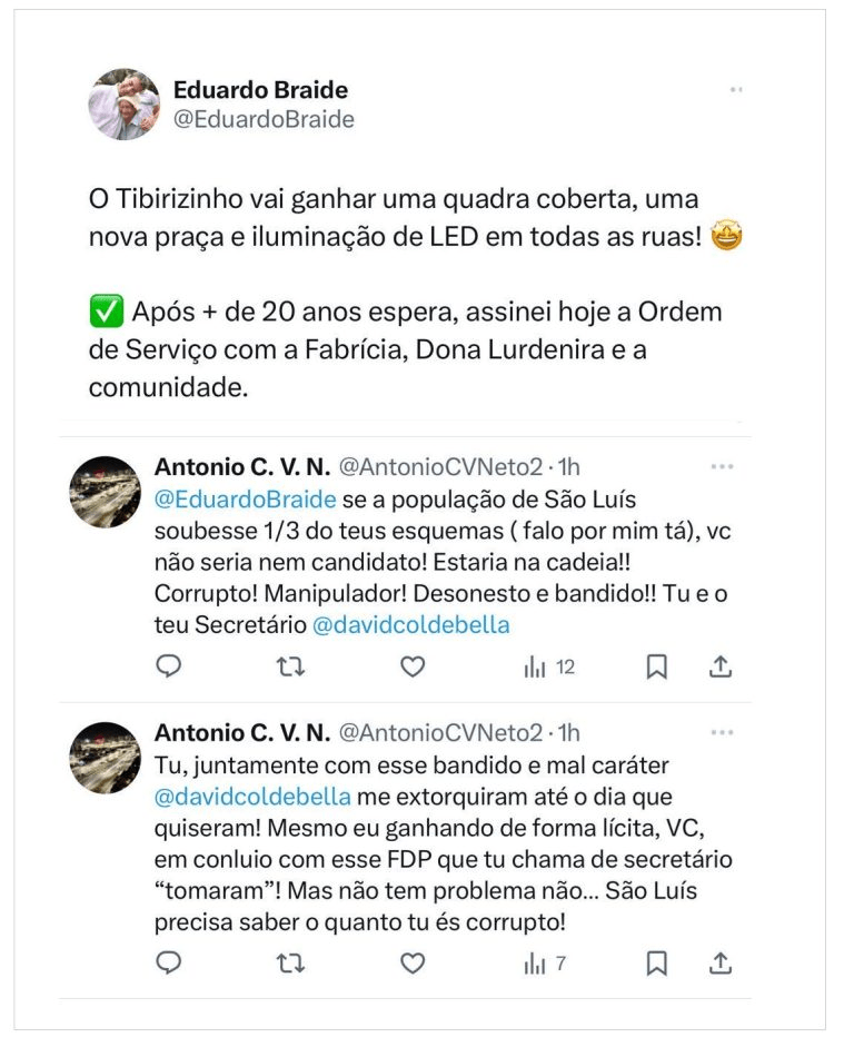 A crise eclodiu publicamente em uma troca de mensagens na rede social X (antigo Twitter). Em resposta a uma publicação do prefeito sobre obras no bairro Tibiri, o perfil de Antônio Calisto fez acusações graves. “Se a população de São Luís soubesse 1/3 do teus esquemas (falo por mim tá), vc não seria nem candidato! Estaria na cadeia!! Corrupto! Manipulador! Desonesto e bandido!!”, escreveu.