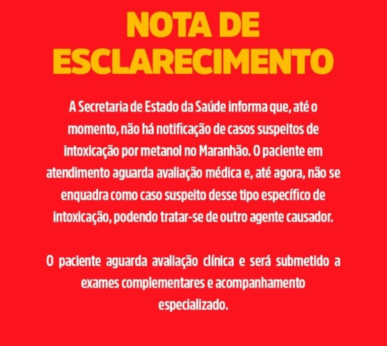 A Secretaria de Estado da Saúde do Maranhão (SES-MA) emitiu uma nota, nesta sexta-feira (10), para esclarecer que não há registro de casos suspeitos de intoxicação por metanol no estado. O comunicado foi feito após a transferência de um paciente do município de Monção para o Hospital Carlos Macieira, em São Luís, gerar rumores sobre uma possível contaminação pela substância.